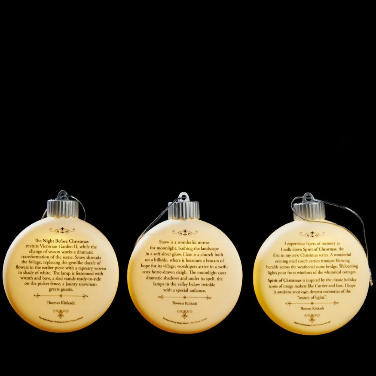This Charming Assortment Of Thomas Kinkade Porcelain Led Ornaments Will Make A Wonderful Addition To Your Christmas Tree. On One Side Of The Colorful Circular, Flat-Shaped Ornaments Are Beautiful Illustrations By The Renowned Artist That Encourages You To Pause, Smile And Enjoy The Holiday Season. On The Reverse Side, Kinkade Describes In His Own Words The Inspiration Behind These Festive Pieces Of Art. They Come Ready With Individual Gift Bags For Easy Gifting.