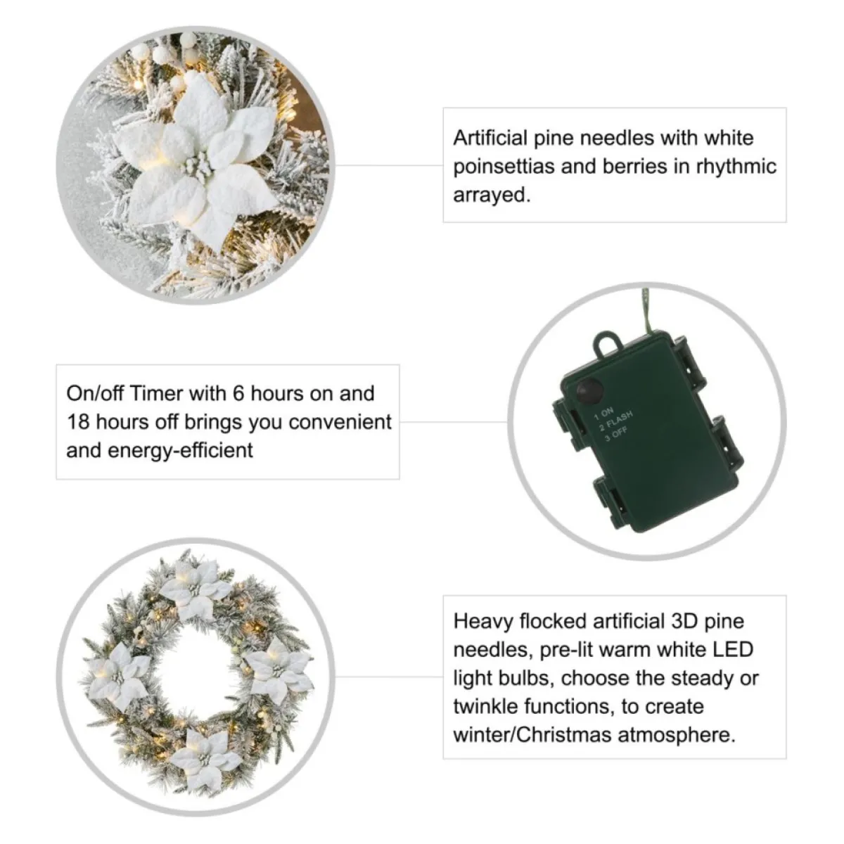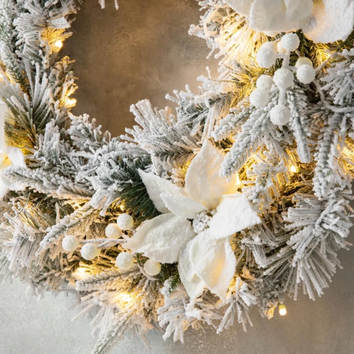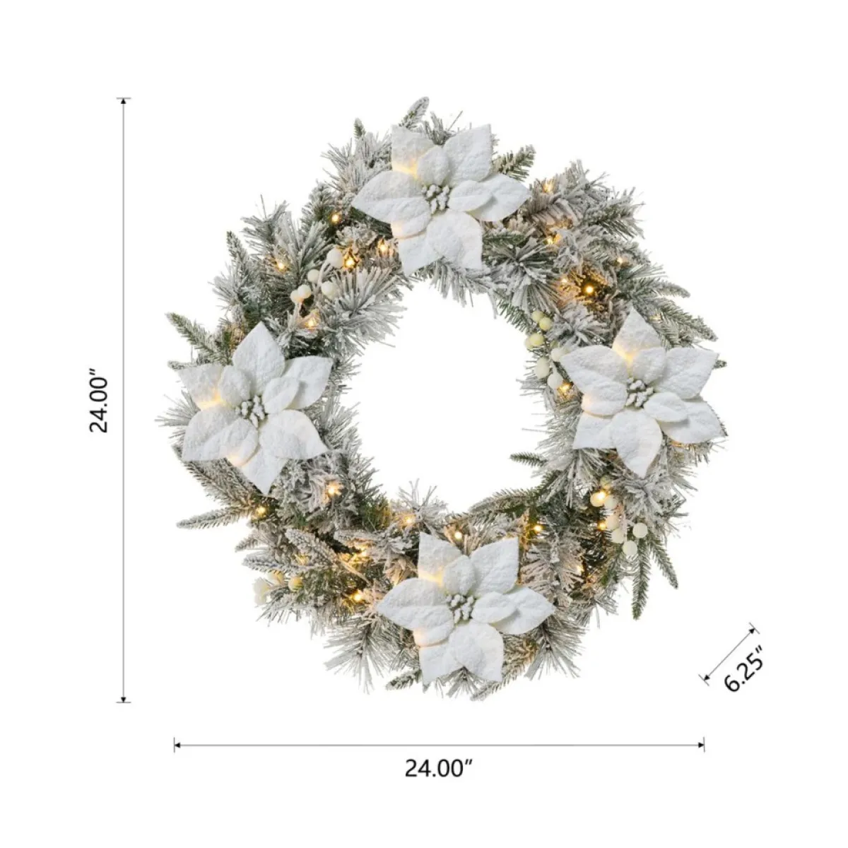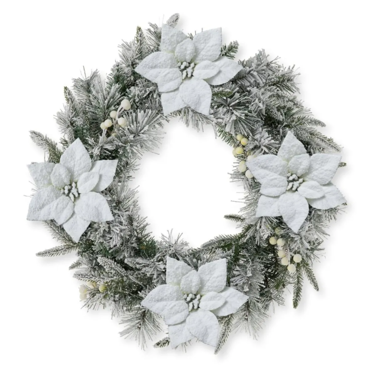 This Snow Flocked Christmas Wreath Is Crafted With Pine Needle Tips, Poinsettia, And White Berries. It Will Add A Touch Of Charming Light And Cheer To Your Front Door Or Window During Your Holiday Season.