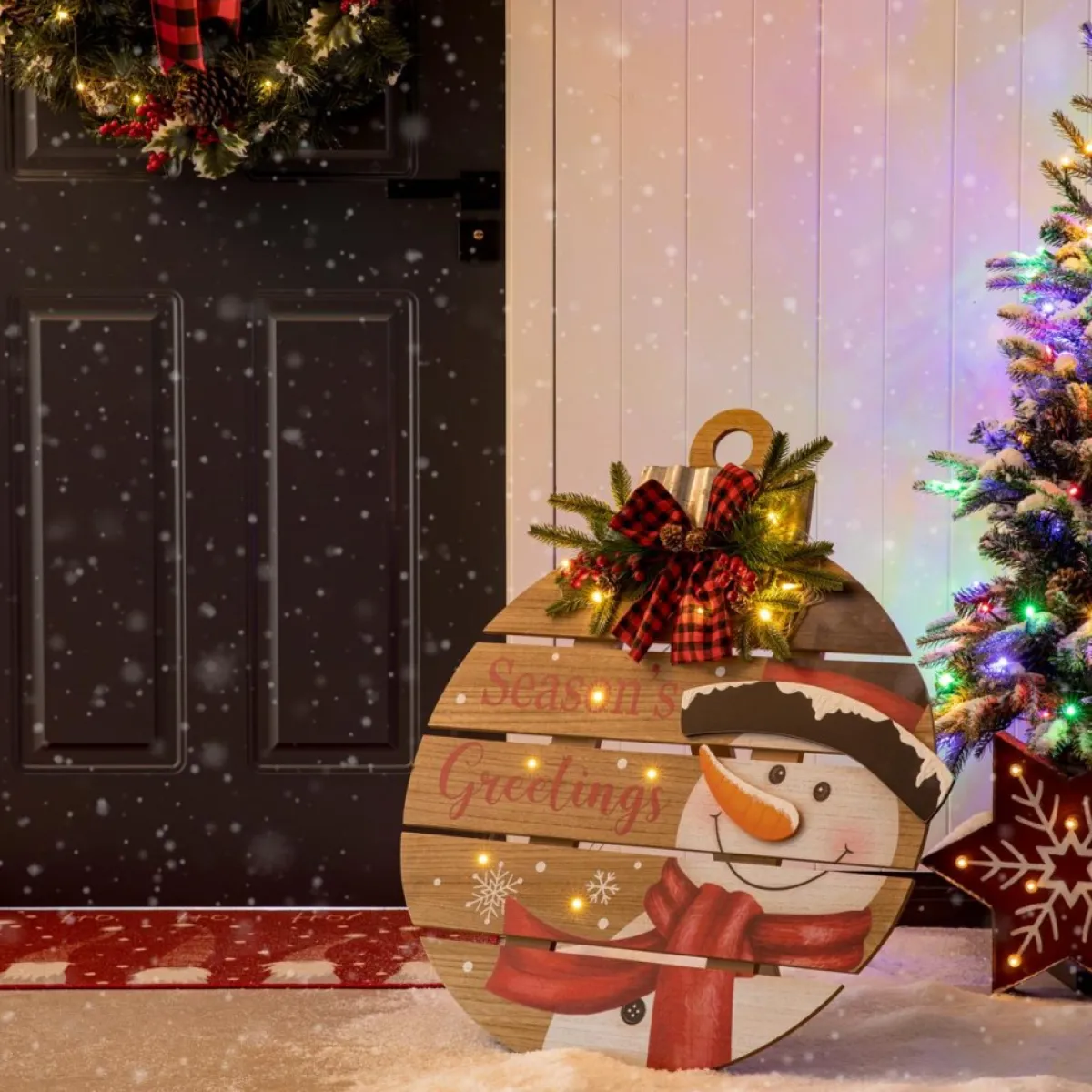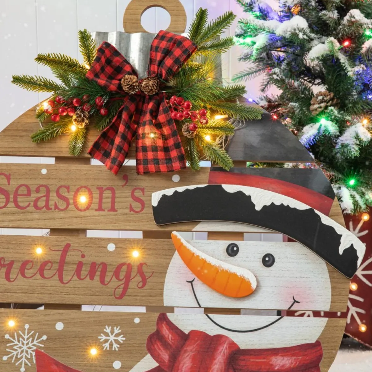 For A Stylish Way To Welcome Guests In Your Outdoor Space, Perch This Delightful Easel Sign On Your Porch. This Christmas Snowman Market-Inspired Design Features A Mix Of Fonts In Natural, White And Classical Red That Add A Graphic Focal Point In Your Home. Embellished With Artificial Flower And Linen Plaid Bowknot For Vitality Of The Winter. It Also Offers A Delightful Way To Greet Guests On The Front Porch, Or To Add A Splash Of Color And Character Out On Back Yard.