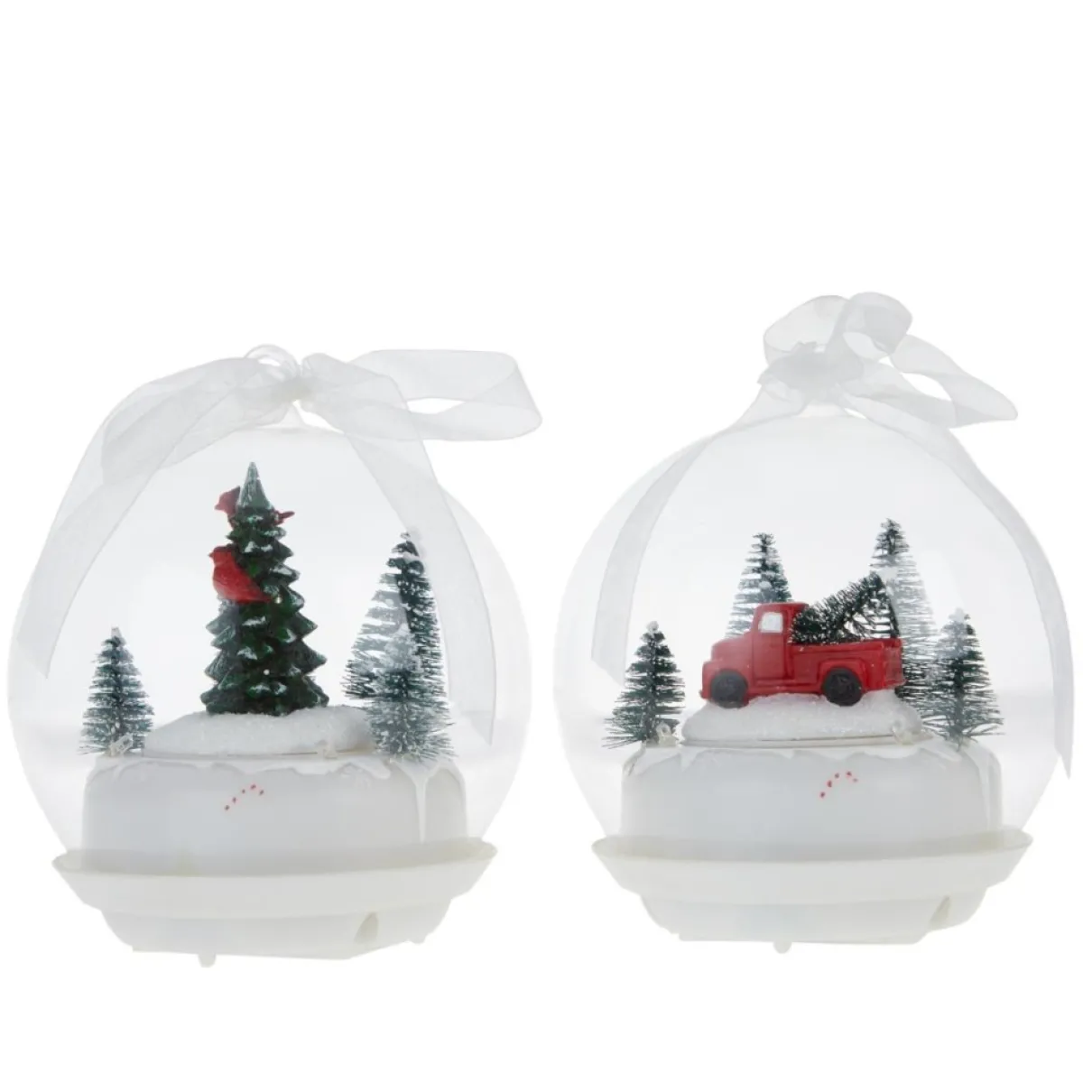 - 2 Glass Led Tabletop Ornaments; 1 Musical Ornament With Vintage Truck And 1 Musical Ornament With Cardinals In A Tree